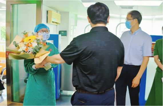 我院院长傅其宏、副院长唐尤超向一线医生送鲜花。